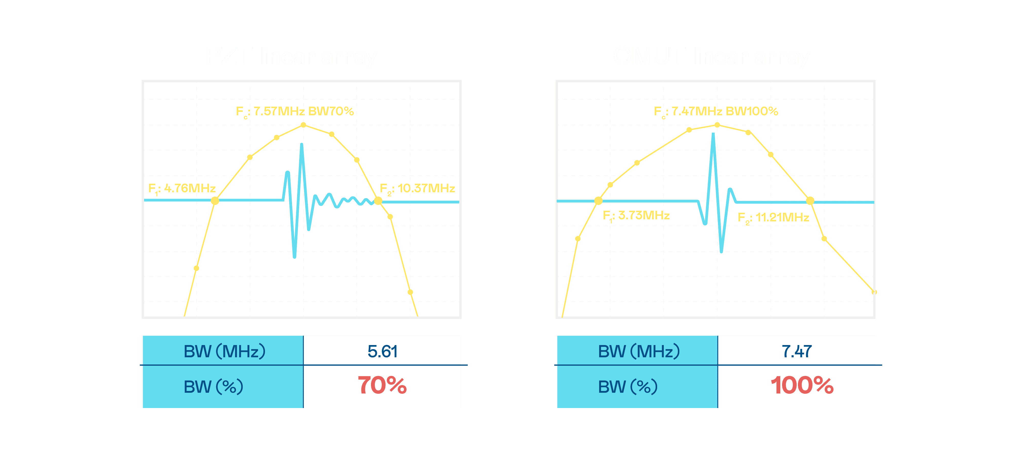 超音波影像的解析度高低,,,首先取决于探头能发出的讯号频宽。。。。z6mg·人生就是博 CMUT 可提供高清晰的超音波讯号,,提供高频宽、、、、高灵敏度、、、影像纹理细节更高的超音波影像,,,,协助医护人员缩短影像判读时间及利用精准的医疗影像进行诊断。。。。